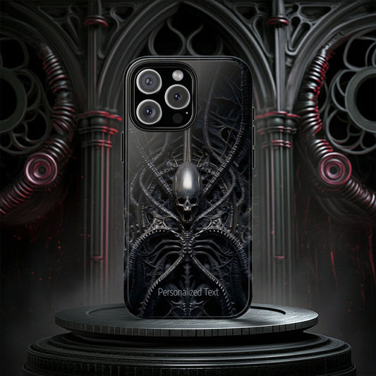 Biomechanical Skull Phone Case – Dark Sci-Fi Gothic Design with Optional Personalized Text