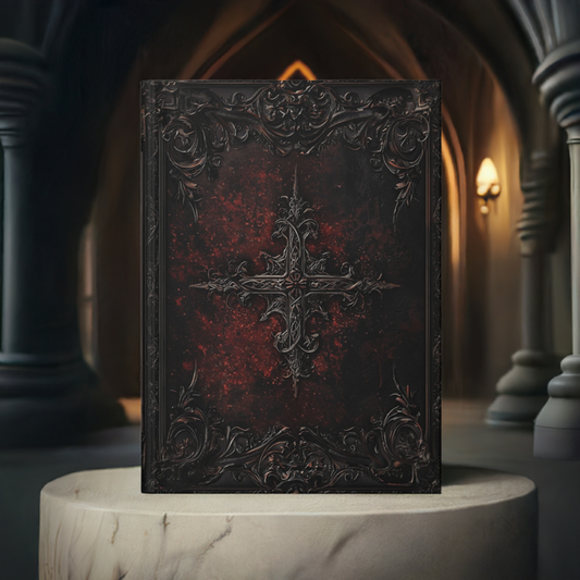 Dark Gothic Cross Notebook with Intricate Red Embossed Cover