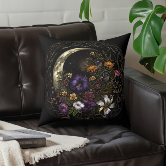 Gothic Moon Floral Art Throw Pillow - Spun Polyester Square Cushion with Moon and Flowers Design