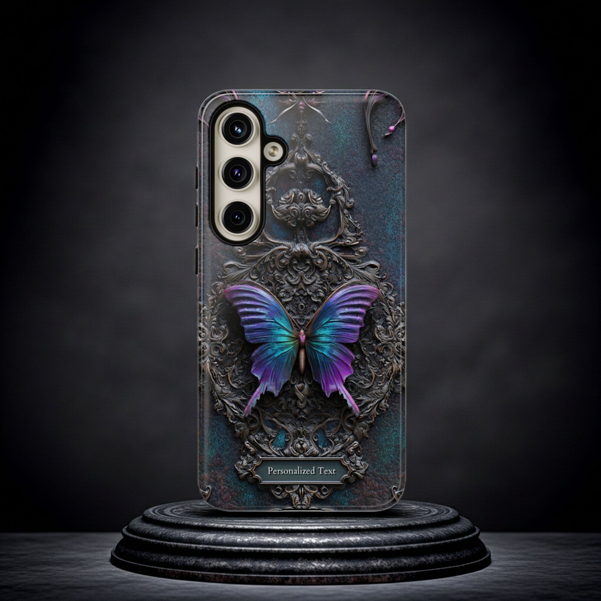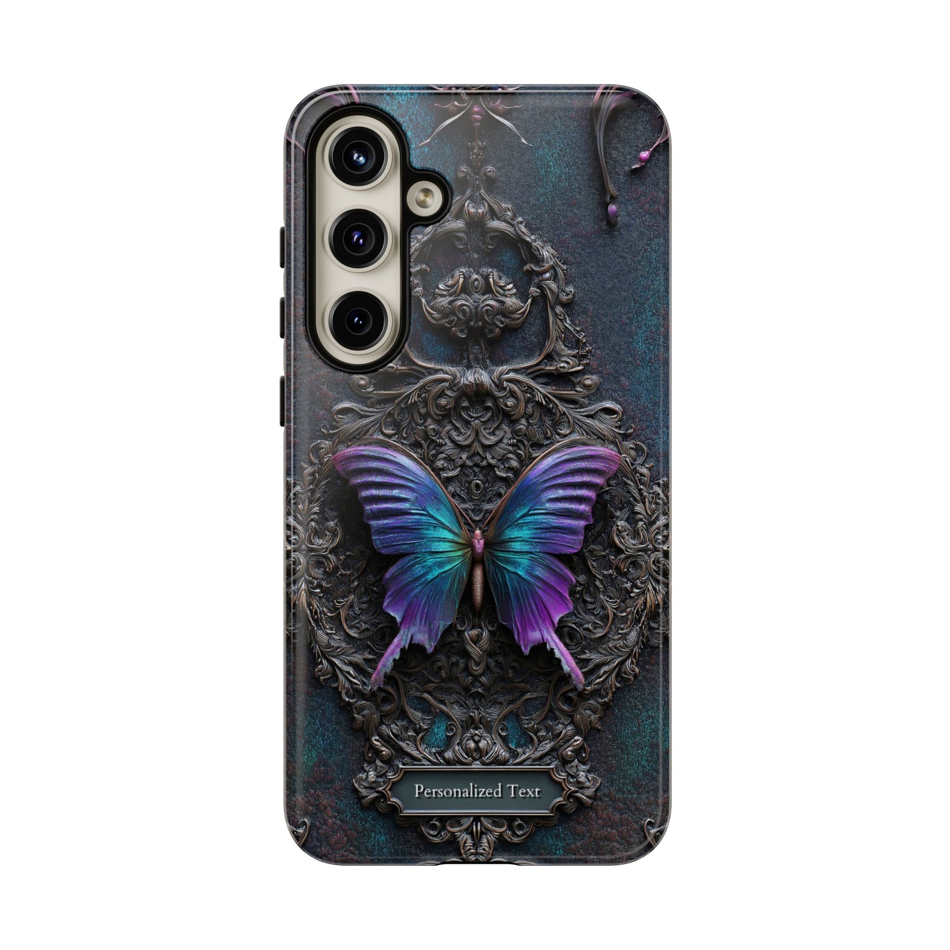 Gothic Butterfly Phone Case - Purple and Teal Wings on Ornate Frame - Personalized Text Available (MATTE VERSION)