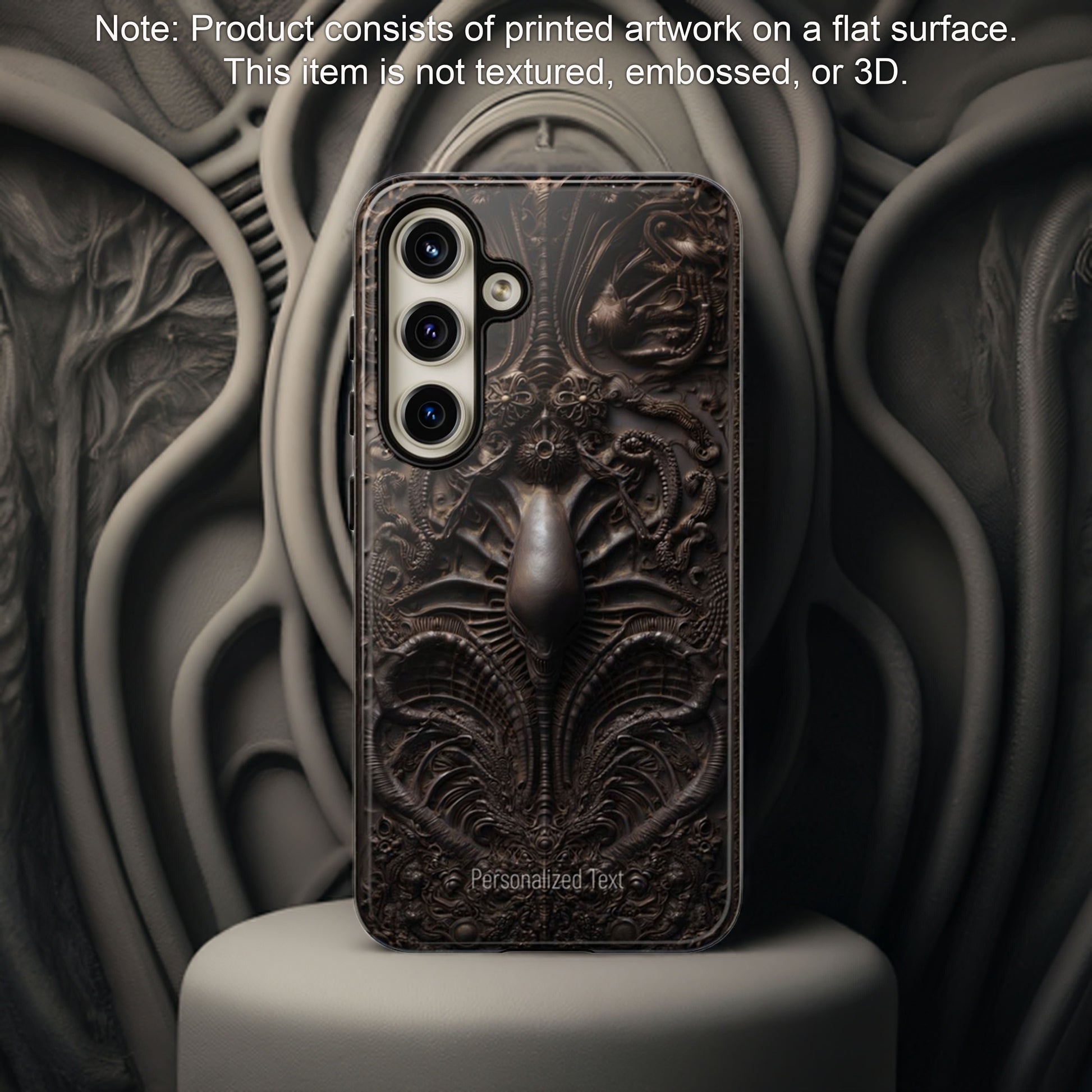 Dive into a dark, surreal realm with our Personalized Alien Horror Phone Case, inspired by the biomechanical nightmares of H.R. Giger. Featuring an intricately detailed alien form entwined in mechanical tendrils, this design is a must-have for fans of sci-fi, horror, and surreal art. Add your customized text to the bottom panel for a unique and eerie twist.